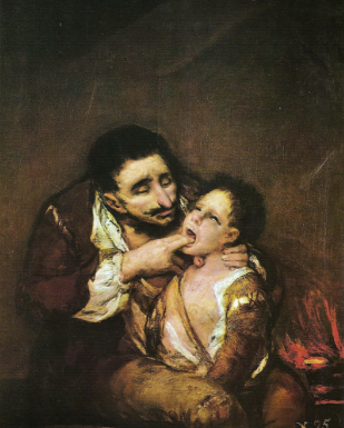 The traditional title of this painting is Curacion del Garrotillo, or “Treatment of Diphtheria,” an infection that is sometimes complicated by peripheral neuropathy. Although Goya is thought to have completed the painting sometime between 1802 and 1812, he did not assign a title. The painting was eventually obtained by the physician Gregorio Maranon (1887–1960), who interpreted the scene as a physician attempting to prevent suffocation by the pharyngeal membranes of diphtheria. It was Maranon who assigned the title we now use.